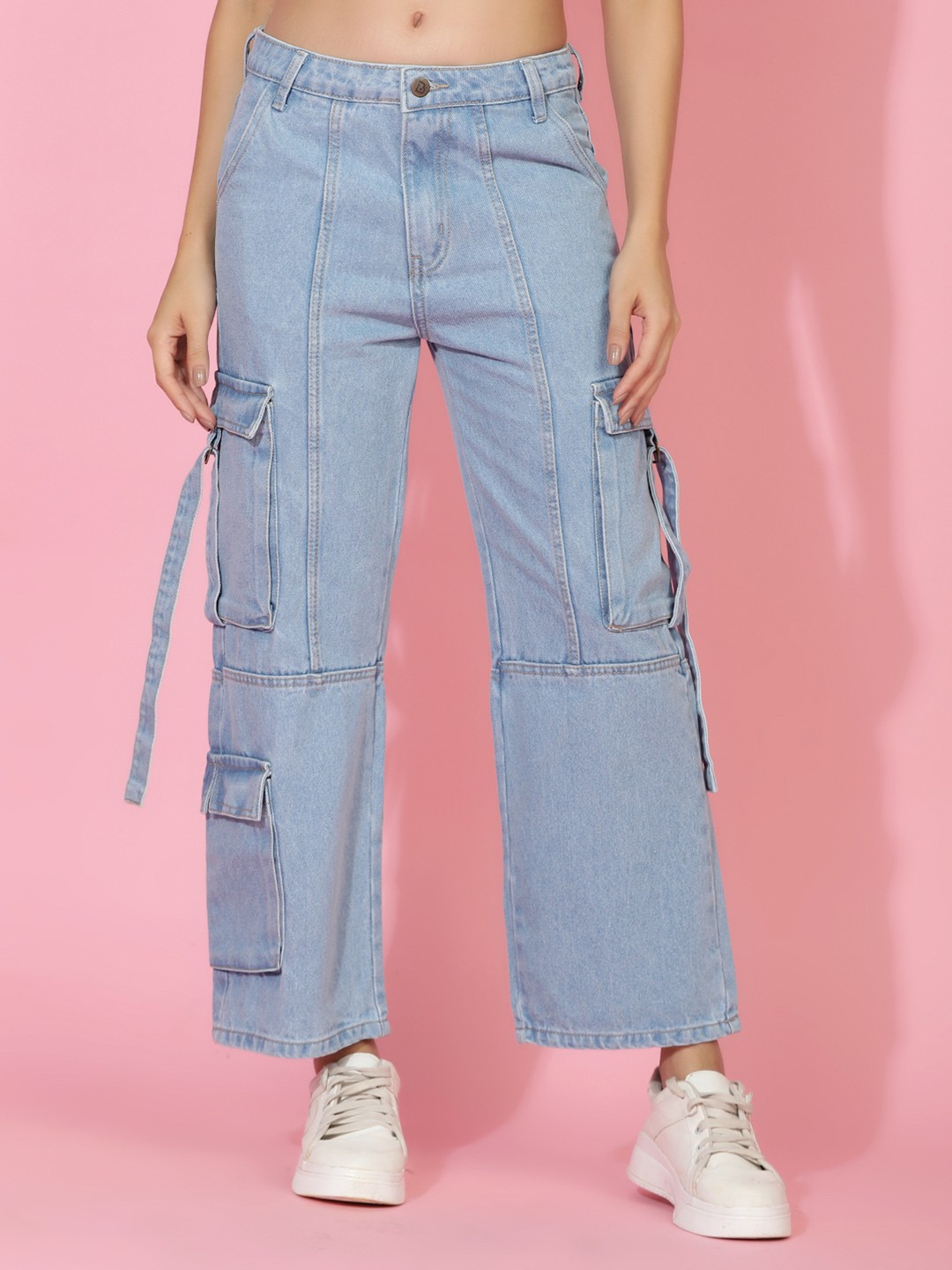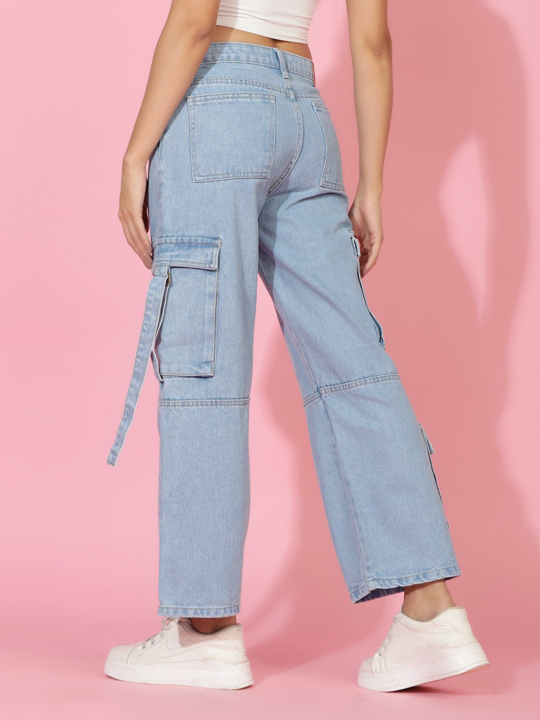 Women Wide Leg High-Rise Clean Look Stretchable Cargo Jeans